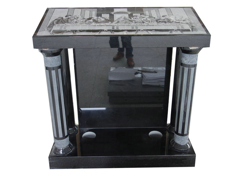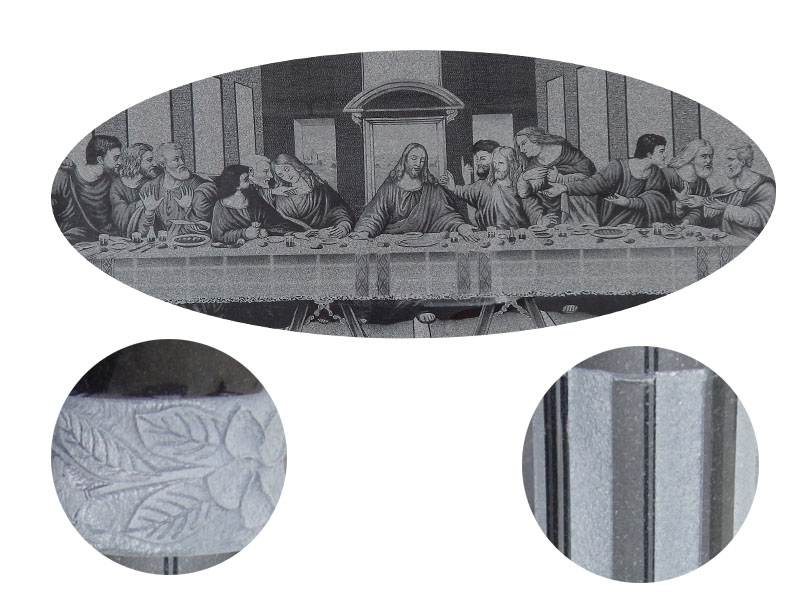 It features an laser etching \”last supper\” in black granite.